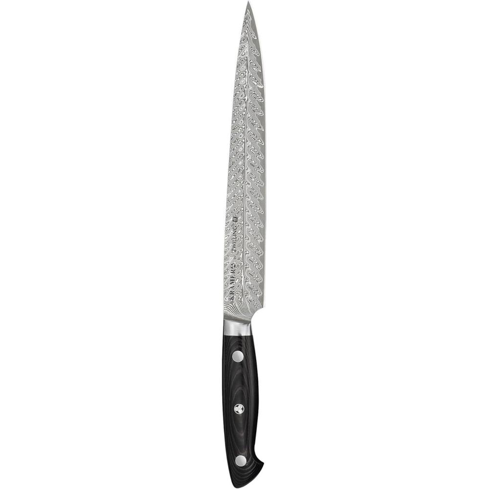 Created with Master Blade smith Bob Kramer, the KRAMER by ZWILLING EUROLINE Stainless Steel Damascus Collection features stainless steel blades made to his exacting standards, maximizing curves, balance and utility. Bob's design has an extremely wide blade to maximize knuckle clearance for larger hands and for cutting through large produce and piles of food. Chopped food can easily be transported with this impressive, broad blade. The knives are hand-finished with a traditional 3-step process by skilled Japanese artisans. Combined with the SG2 micro-carbide powder steel, the ice-hardened CRYODUR blades deliver scalpel-like sharpness, stay sharper longer and can withstand more sharpening over their lifespan. The SG2 super steel core is protected by an exceptionally beautiful 100-layer Chevron Damascus pattern, which is complimented by a stunning black linen Micarta handle and signature Bob Kramer mosaic pin.